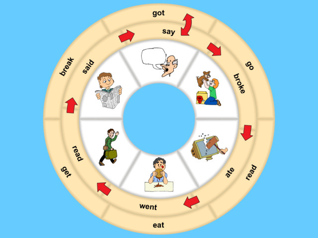 Következzen most egy egyszerűbbnek tűnő játék. Ezúttal a két külső kerékben található összekevert címkéket kell a belső gyűrűben lévő képekhez forgatnod a nyilak segítségével. Mindeközben, ha magukra a címkékre kattintasz, akkor fel is cserélheted őket a két gyűrű közt. A cél az, hogy a játék végén a külső gyűrűbe a képekhez tartozó igék jelen ideje, a belsőbe pedig azok múlt ideje kerüljön.